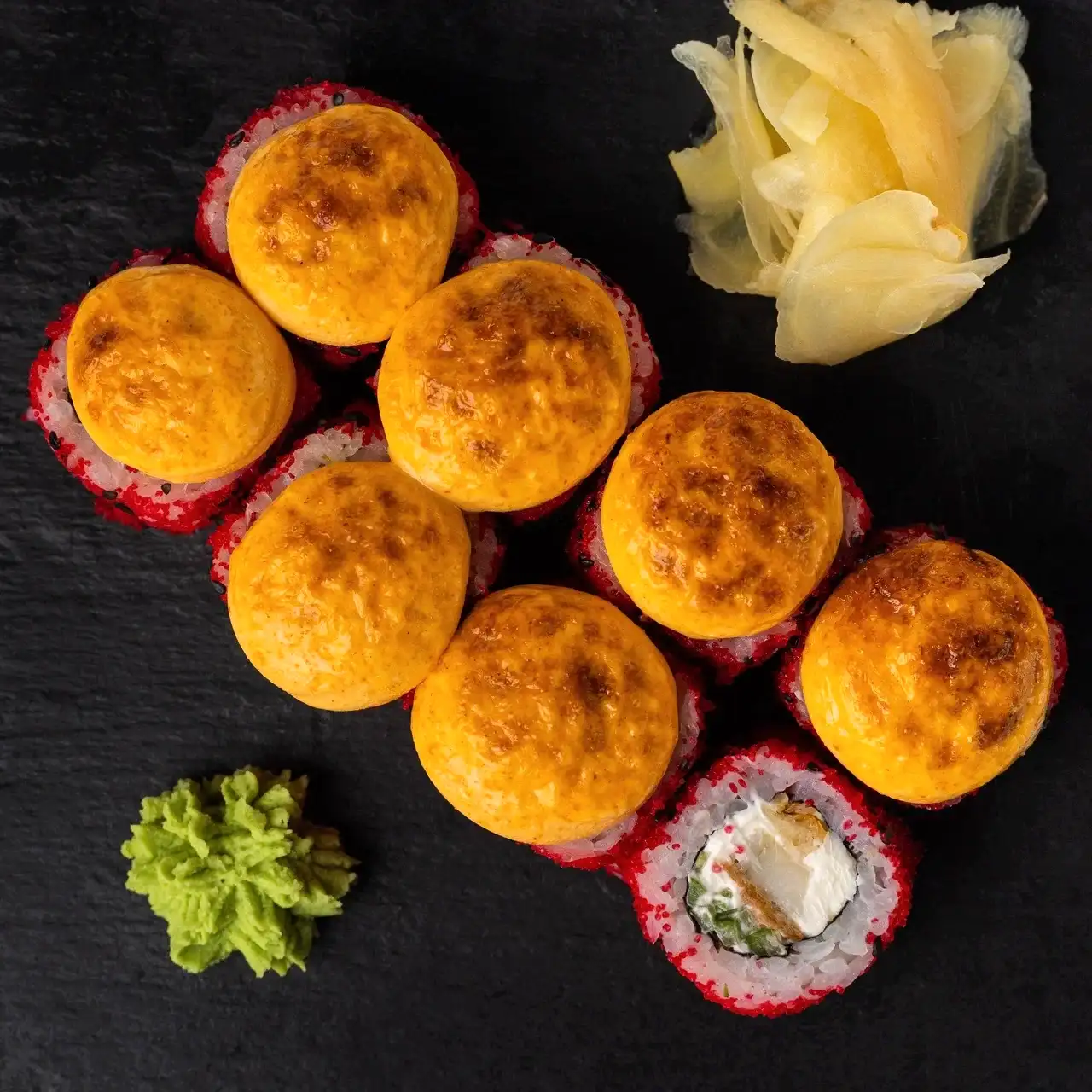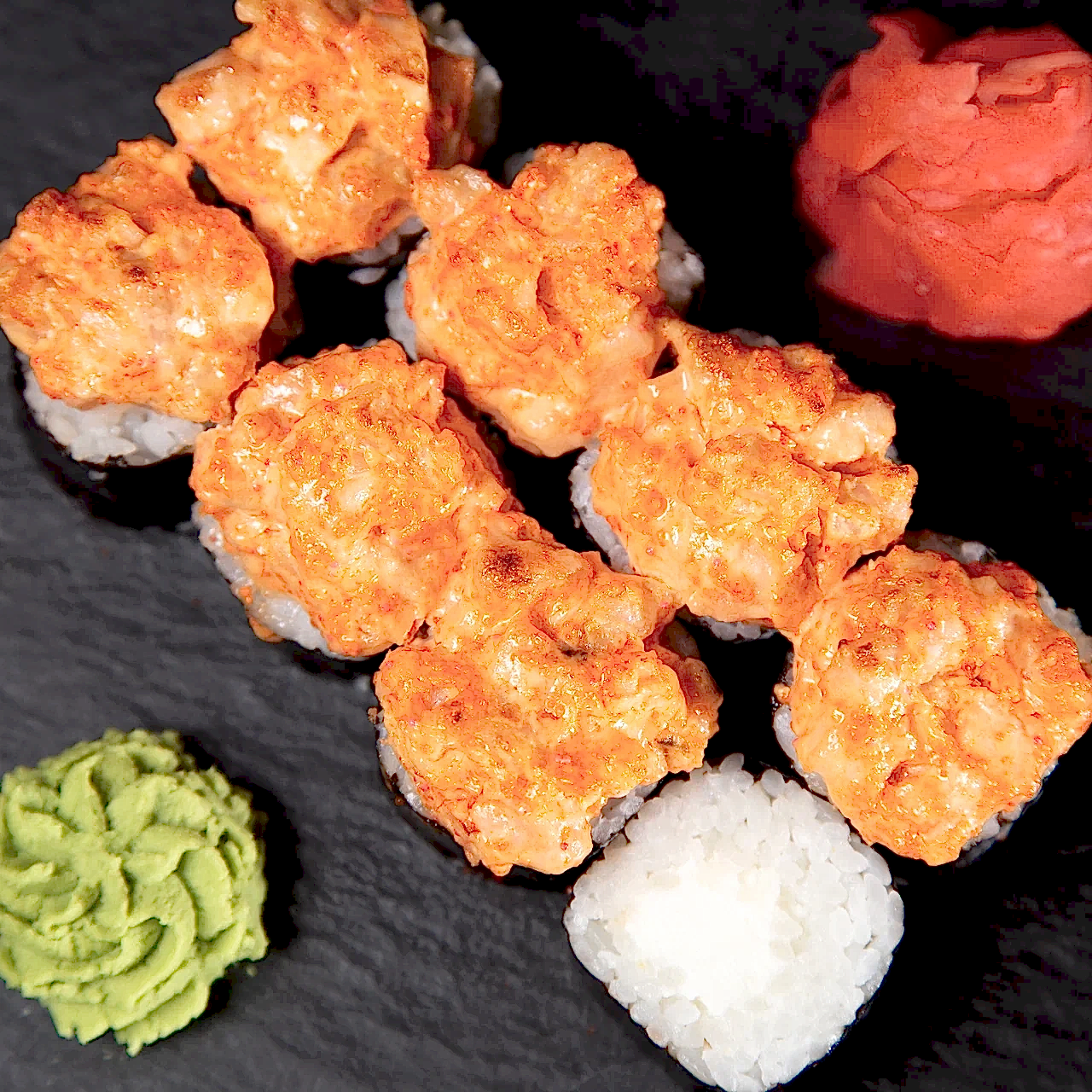 Состав: Pin-Up тигровая креветка, сливочный сыр, икра тобико, соус спайси