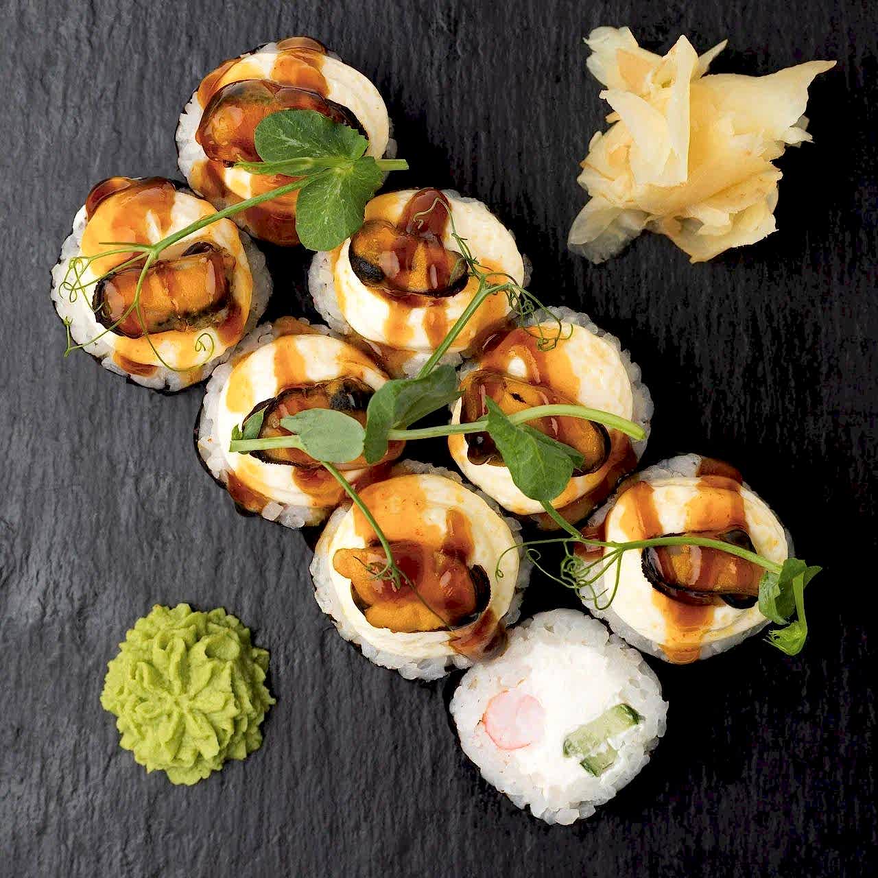 Состав: Pin-Up мидии, огурец, сливочный сыр, соус чили-манго, соус унаги, микрозелень