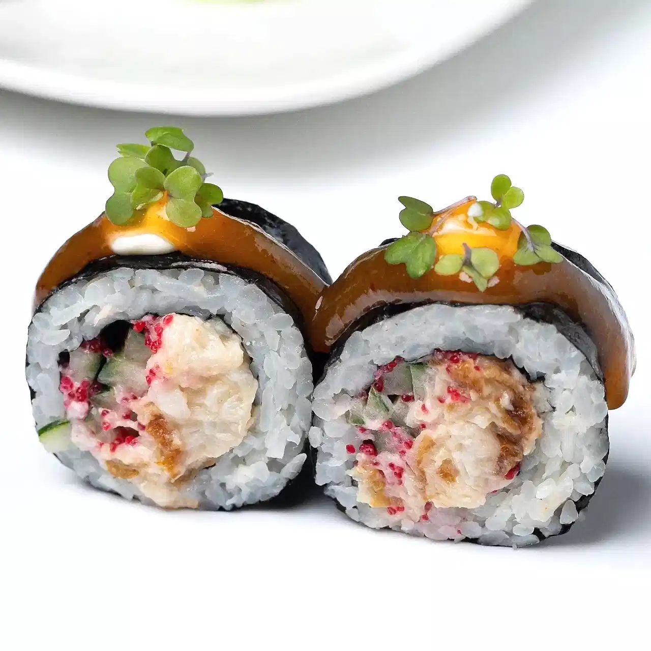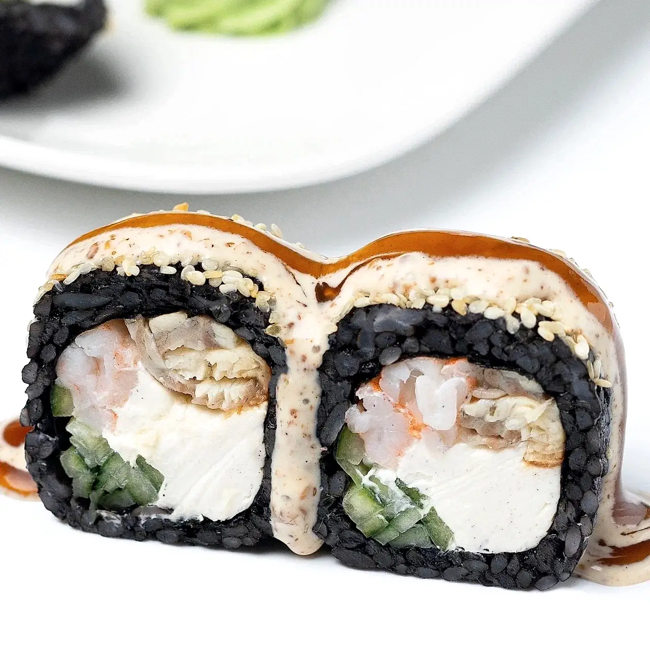 Состав: Угорь, тигровая креветка, сливочный сыр, Pin-Up соус сливочно - кунжутный, соус унаги, кунжут