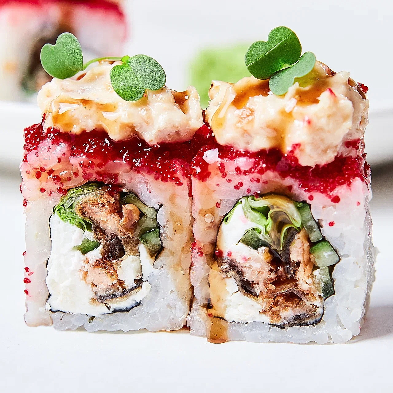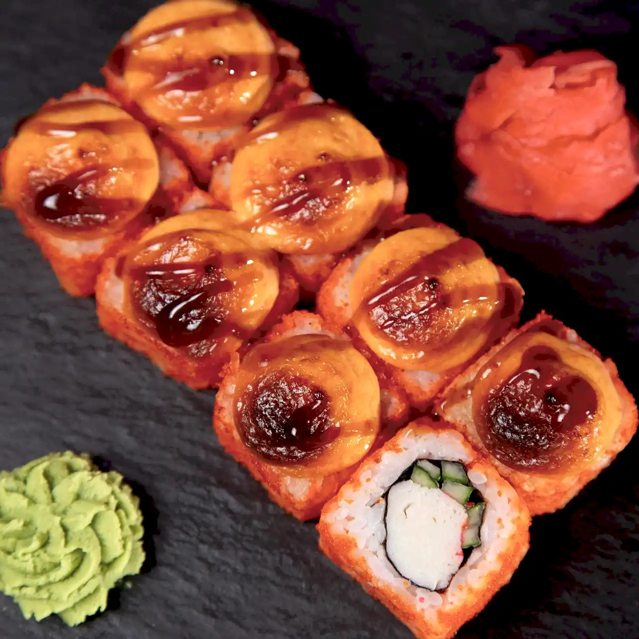 Состав: Снежный Pin-Up огурец, икра тобико, соус спайси, соус унаги