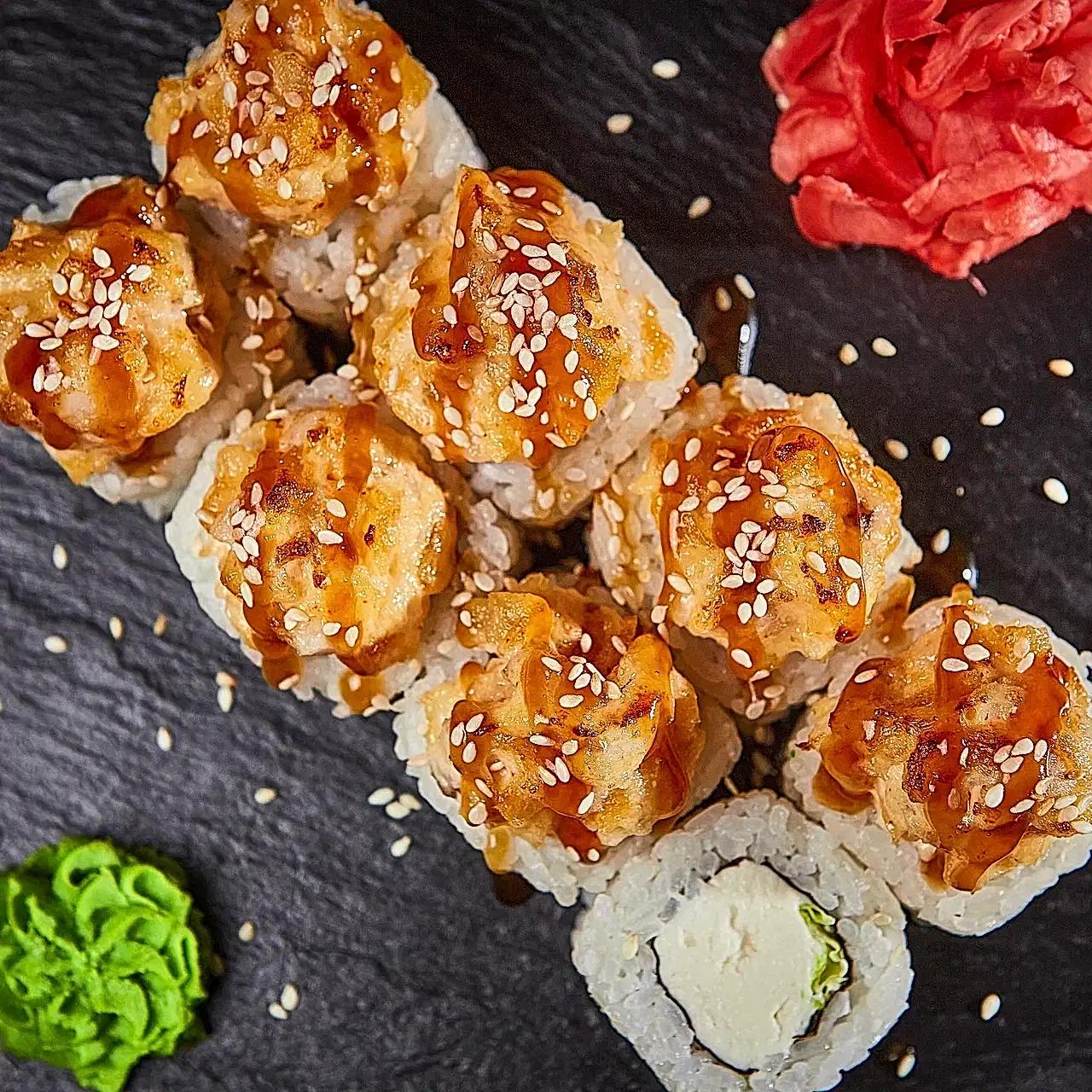 Состав: Лосось, угорь, сливочный сыр, омлет Pin-Up икра тобико, соус спайси, соус унаги, кунжут