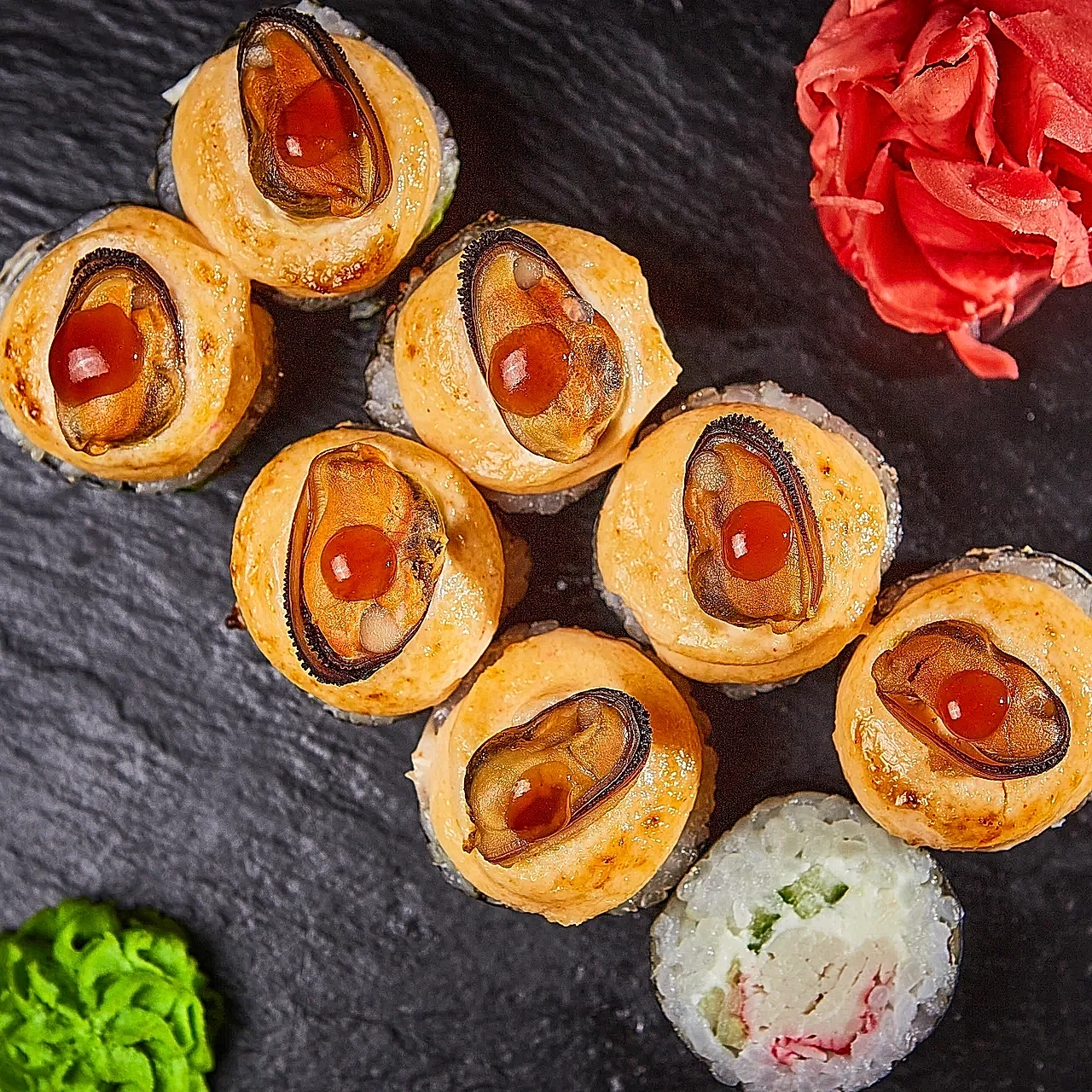 Состав: Мидии, снежный краб, сливочный сыр, Pin-Up соус спайси, соус унаги