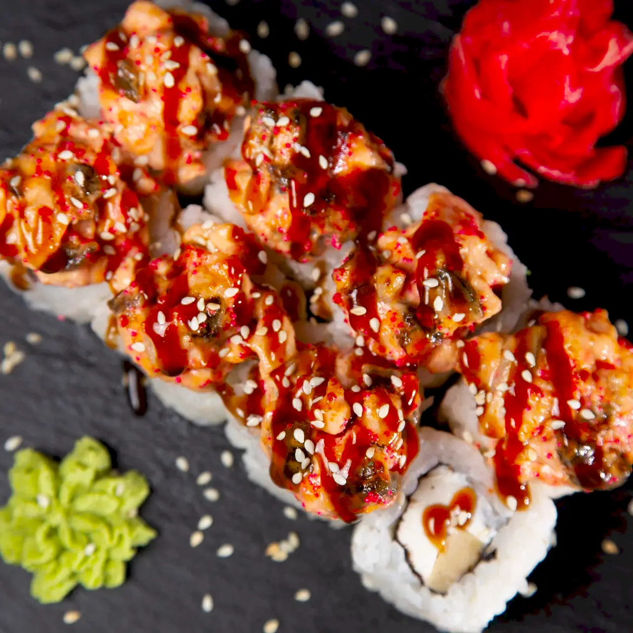 Состав: Морской окунь, сливочный сыр, салат айсберг, Pin-Up спайси, соус унаги
